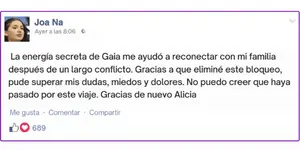 En realidad no tengo testimonios de personas que ya hayan adquirido este programa Energía secreta de Gaia para plasmarlas aquí, salvo las que puedes ver arriba que fueron tomadas de su sitio oficial al momento de hacer el pago. Tampoco me puedo permitir inventar opiniones falsas sobre esta formación solo para decirte que esto funciona.